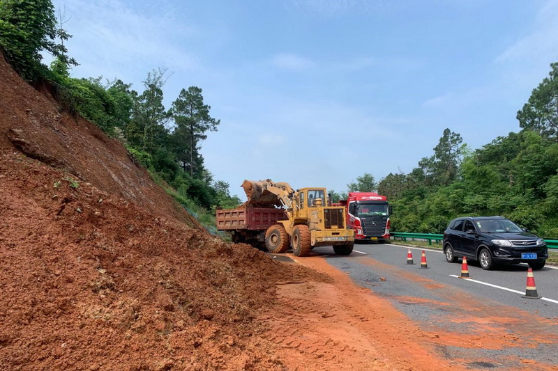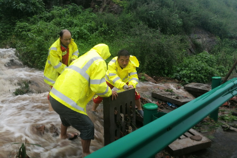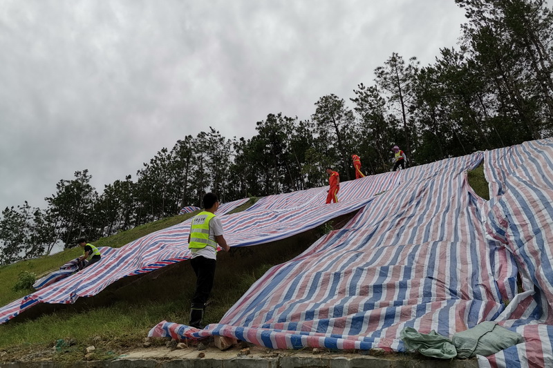 汛期來臨之前,廣德新鳳公司提前部署,組織養護作業人員對全線橋涵、邊溝、泄水槽和排水溝等設施的雜物、泥土、雜草進行全面排查、清理,保證排水通暢、道路安全。由于降水集中且雨量較大,部分邊坡經雨水沖刷導致局部坍塌,項目公司第一時間到達現場,判斷坍塌影響程度,安排人員放置錐形桶等警示防撞設施,保障過往車輛安全出行。同時搶抓晴好天氣,組織養護隊伍采取濾網覆蓋等措施對邊坡加固,防止安全隱患發生。