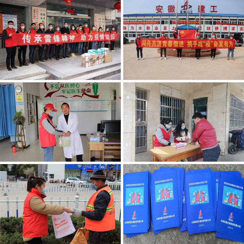 黨有號召,團有行動。在疫情防控工作的關鍵時期,公司團員青年立即行動,積極參與。公司機關赴合肥市廬陽區人民政府三孝口街道辦事處開展疫情防控志愿活動,向辦事處捐贈口罩、消毒液及手套等防疫物資,在辦事處負責人的帶領下,走進百大CBD寫字樓、九州大廈、永紅路社區等地,向群眾宣傳防疫知識,幫助測量體溫,指導掃描“安康碼”,做好人員出入登記。懷寧安建公司集中觀看了武漢雷神山建設視頻短片。隨后,志愿者前往各工區駐地、沿線已拆遷的百姓家庭以及村衛生院,贈送口罩、84消毒液、防疫知識手冊等,助力群眾共同戰“疫”。淮北安建公司、淮北交通公司主動請纓來到淮北市特鑿公司小區,協助測量體溫、登記來訪人員、排查外來住戶,向居民發放宣傳手冊,宣講疫情防控知識。太湖安建公司根據集團和公司下發的防疫知識手冊,改編成普通居民可用版并裝訂成冊,分發給駐地太湖縣赤土嶺居民,提高居民的防疫意識。靈璧安建公司把防護口罩送到辛勤工作的環衛工人手中,把溫暖送到他們的心上。
