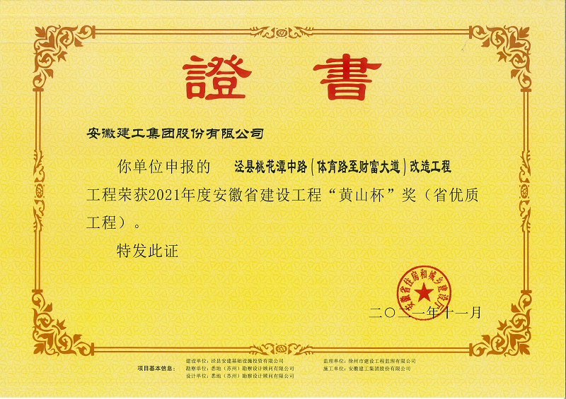 喜訊!安建投資涇縣PPP項目桃花潭中路改造工程喜獲安徽省建設(shè)工程“黃山杯”獎