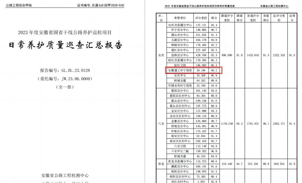 近期,安徽省公路檢測中心發布《2023年度安徽省國省干線公路日常養護質量巡查報告》,建工投資懷寧PPP項目巡檢結果喜獲佳績,巡查檢測得分為安慶地區養護單位第一名。